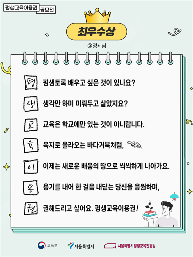 서울시는 평생교육이용권 운영 첫해의 성과를 발굴하고 이를 확산하기 위해 지난해 11월 '2025 서울시 평생교육이용권 공모전'을 개최했다. 심사를 거쳐 ▲최우수상 3명 ▲우수상 7명 ▲장려상 10명 ▲사용기관 우수사례 2개 기관을 선정하고 학습 우수사례 수기집에 담았다. 공모전에는 총 421건의 작품이 접수됐으며, N행시 공모전에서는 최우수상 1명, 우수상 1명, 장려상 3명이 선정됐다.