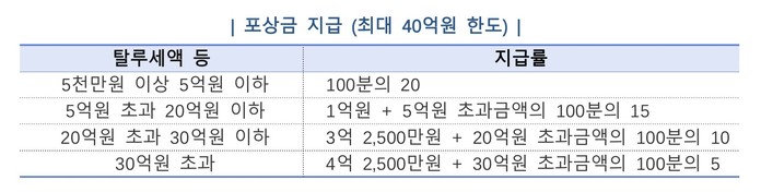 국세청은 부동산 탈세 신고에 대한 포상금으로 최대 40억 원을 지급하며, 국민의 적극적인 참여를 당부했다. 국세청은 9일, 제보자가 중요한 자료를 제출해 세무조사가 진행된 후 추징세액이 5000만 원 이상 납부되면 탈루세액을 기준으로 최대 40억 원의 포상금을 지급한다고 밝혔다.