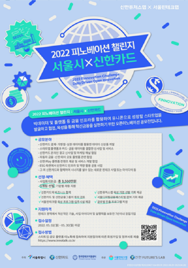 서울시는 신한금융지주와 협업해 유망 핀테크 기업을 발굴하는'2022 피노베이션 챌린지:서울시×신한카드'를 개최한다고 2일 밝혔다. 올해 처음 개최되는 이번 챌린지에서는 총 3개 기업을 선발하여 서울핀테크랩 입주(1년), 신한카드 사업화 협업, 전문가 멘토링, 투자유치와 글로벌 진출에 이르는 전폭적 지원을 제공한다.