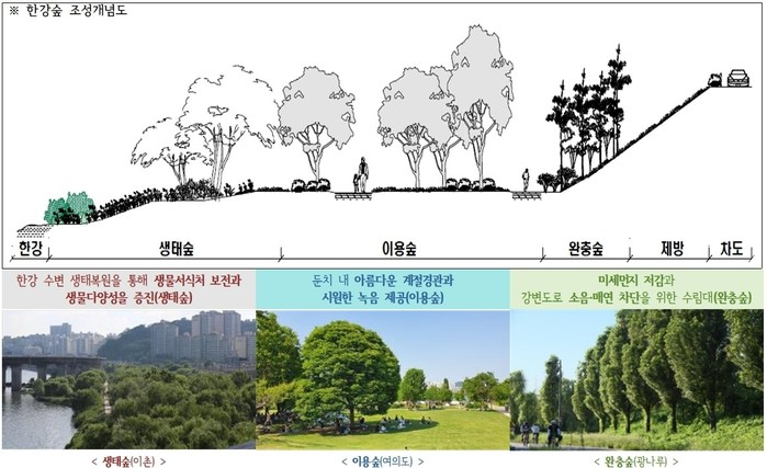 한강숲은 자연성 회복에 방점을 둔 ‘생태숲’, 나무 그늘을 만들어 시민의 쉼터가 되어주는 ‘이용숲’, 미세먼지와 소음.매연을 차단해 주는 ‘완충숲 등 식재 위치와 기능을 고려해 조성된다.