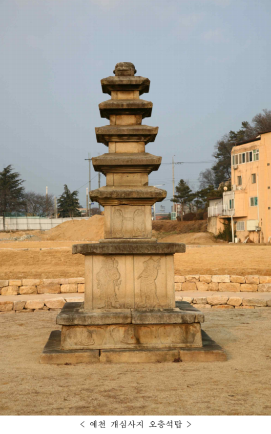 ‘예천 개심사지 오층석탑’은 1011년에 건립된 석탑으로, 석탑에 새겨진 190자의 명문을 통해 건립 시기와 과정을 알 수 있다. 이 석탑은 십이지신상과 팔부중상, 금강역사상을 조각하여 불교 교리를 충실히 반영하고 있으며, 독창적인 조각 방식과 예술적 완성도가 뛰어나다.