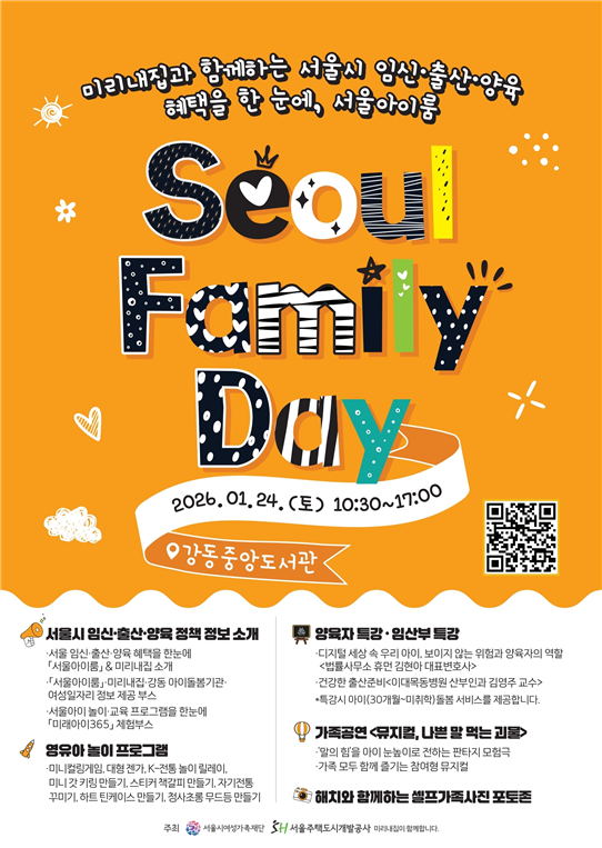서울시여성가족재단은 2월 오픈을 앞두고 시민 체험형 소통 행사 ‘서울패밀리데이’를 1월 24일에 개최한다. 이 행사는 미리내집 입주민과 강동 지역 주민을 대상으로 서울시 임신·출산·양육 정책을 안내하는 팝업스토어로, 강동중앙도서관에서 열린다. ▲서울아이(i)룸 체험 부스 ▲미리내집 정보 부스 ▲더블케어 여성 대상 일자리 및 양육 정보 지원 ▲서울미래아이365 홍보 부스 ▲임산부 및 양육자 특강 ▲영·유아·아동 놀이·돌봄 프로그램 등이 운영된다.