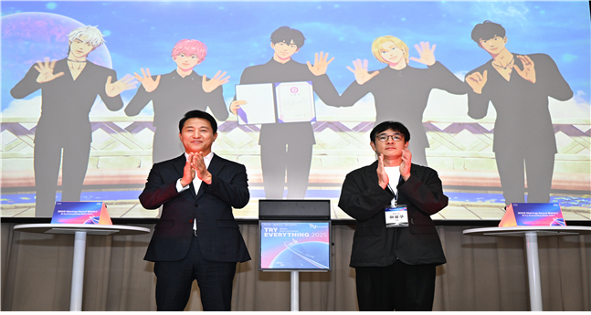 | ▲지난 12일(화) 오전 ‘2025 Startup Seoul 홍보대사 및 Try Everything 홍보단’ 위촉식에서 오세훈 서울시장이 이성구 블래스트 대표(오른쪽), 플레이브와 기념촬영하고 있다. |