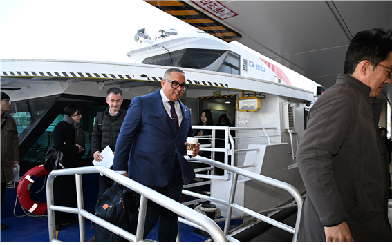 | ▲23일(월) 데이비드 파나이오투(런던리버서비스 헤드), 조나단 피게로아(뉴욕페리 수석부사장)가 한강버스에 탑승하여 현장을 직접 답사하고 있다. |