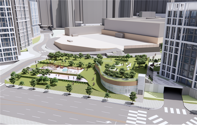 지형순응형 대지조성 계획을 통해 최대 26m의 고저 차를 활용해 주차장과 주민공동시설을 효율적으로 배치했다. 계단과 엘리베이터를 설치해 보행약자도 편리하게 이동할 수 있도록 했다. 학교와 서부선(신설)과 연계한 공원계획으로 단지와 지역을 유기적으로 연결하는 열린 단지를 구현했다. 학교 전면에는 어린이공원을 계획해 개방감을 확보하고, 공원 복합화시설로 서울형 키즈카페를 도입해 양육친화단지로 만들었다.
