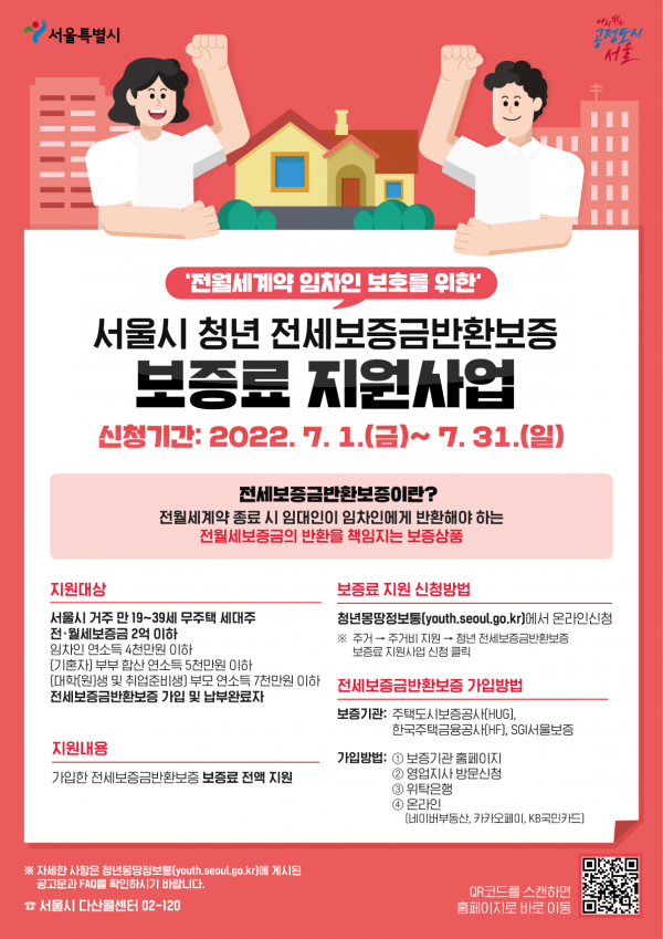 서울시는 ‘전세보증금 반환보증’ 심사·발급에 평균 2~3주가 소요되고 신청 마지막 날인 7월31일까지 유효한 보증서에 대해 신청이 가능한 만큼, 아직 ‘전세보증금 반환보증’에 가입하지 않은 청년들은 가입을 서둘러달라고 당부했다.