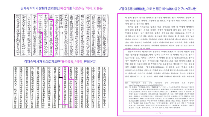 이 문장은 주재육이 입춘으로 새해를 정하고 자시로 날짜의 시작을 정하는 역술인들을, 하승천이 원가력을 만들면서 범한 오류보다 더 심각한 오류라고 직접 비판한 핵심 내용이다. 그런데 김재숙 박사는 이 비판 문장을 논문에서 임의로 제외하고, 그 자리에 뜻이 전혀 다른『신당서(新唐書)』「역지(歷志)」의 문장을 발췌하여『율력융통』「삼정」 편과 결합하여, 『율력융통』 본문인 것처럼 재구성하여 제시했다. 문맥을 인위적으로 구성한 문장을 근거로 비판하였다. 그런 다음 “원문을 잘못 이해한 것이다. …(중략)…하승천보다 무식하다고 말한 것은 아니다. 문맥상 비슷해 보이지만 정확한 해석은 아니다.”라고 필자의 저서와 칼럼의 내용을 오류로 단정하였다. 원문 삭제는 사실의 제거이고, 문헌 접합은 결론의 조작이다. 원문 삭제 → 문헌 짜깁기 → 결론 전도가 확인된다.