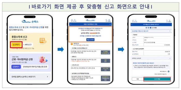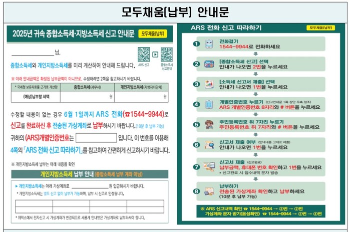 5월은 종합소득세와 개인지방소득세 신고·납부의 달이다. 2025년도에 종합소득이 있는 개인은 6월 1일까지 신고·납부해야 한다. 국세청은 신고 대상자 1333만 명에게 지난 24일부터 카카오톡, 네이버 전자문서, 문자메시지로 신고 안내문을 발송하고 있다. 모바일 안내문을 받은 납세자는 손택스 신고화면이나 ARS(☎ 1544-9944) 신고로 즉시 이동해 신고 절차를 밟으면 된다.