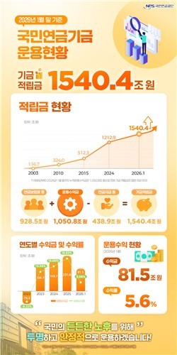 8일 국민연금공단에 따르면, 2026년 1월 말 기준 국민연금 기금 적립금은 1540조 4000억 원에 이르렀다. 1988년 기금 설치 이후 2026년 1월까지 누적 운용수익금은 총 1050조 8000억 원으로, 이는 전체 적립금의 68%에 해당한다. 국민연금이 투자를 통해 자산을 크게 늘렸음을 보여준다.