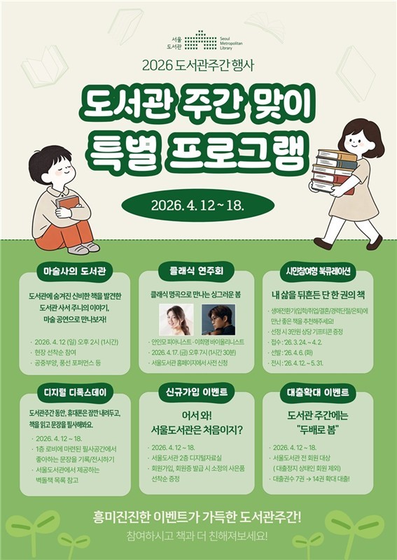 또한, 17일 오후 7시에는 피아니스트 안인모와 바이올리니스트 이희명의 협연이 예정돼 있다. 이 공연은 서울도서관 누리집을 통해 사전 신청이 가능하다. 도서관 주간 동안 서울도서관 1층 로비에서는 시민이 직접 추천하는 생애주기별 도움이 되는 책을 소개하는 북 큐레이션 전시도 진행된다.