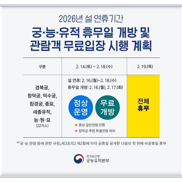 평소 예약제로 운영되는 종묘는 연휴 기간 동안 자유롭게 관람할 수 있으며, 창덕궁 후원은 기존처럼 유료로 운영된다. 칠궁은 2월부터 사전 예약제로 운영되며 제한적으로 관람이 가능하다.