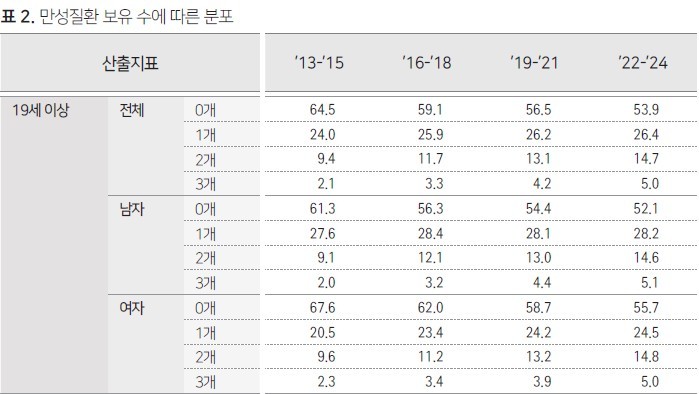 연구팀은 "청년층에서 단일 만성질환 유병률이, 장년층부터는 복합 만성질환 유병률이 증가하고 있다"며 "정책과 사업 추진 과정에서 비만, 음주, 신체활동 부족 등 건강 위험요인 관리를 청년층부터 조기에 개입하고, 장년층부터는 복합 만성질환 예방 및 관리가 필요하다"고 밝혔다.