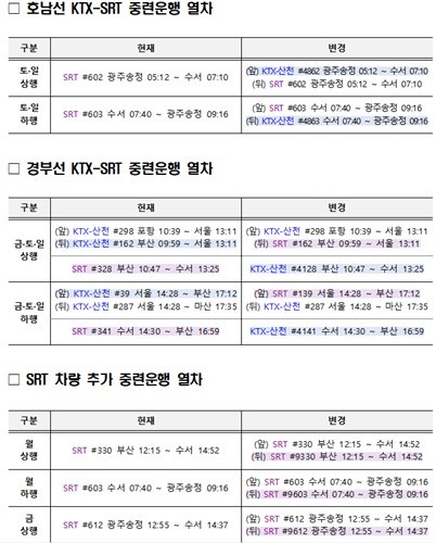총 좌석 공급 규모는 동일하지만, 연결 운행에 따른 안전성과 이용 편의를 중점적으로 점검할 계획이다. 또한 월요일과 금요일 일부 열차는 한국철도공사와 에스알이 고속철도 통합 협의체를 통해 협력해 추가로 확보한 SRT 차량을 연결해 좌석 공급을 확대한다.