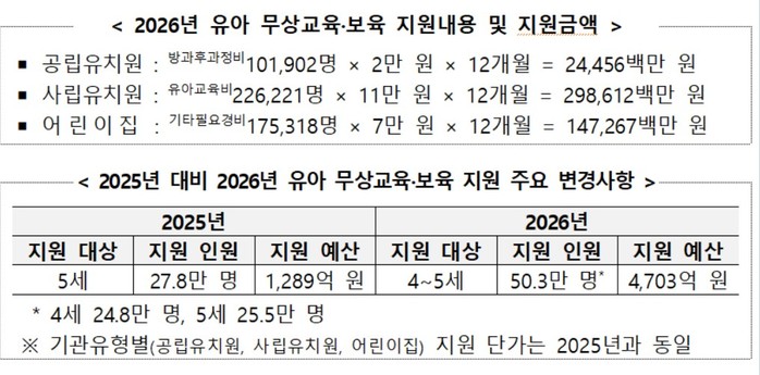 이번 정책은 지난해 5월부터 시작된 5세 유아 무상교육·보육 지원을 4세까지 확대하는 것으로, 이재명 대통령의 공약과 새 정부의 국정과제에 따른 것이다. 지난해 12월 기준으로 유치원 납입금이 전년 동월 대비 26.6% 감소한 것으로 나타났으며, 올해 유아 무상교육·보육 지원에 들어가는 예산은 4703억 원이다. 공립유치원은 매달 방과후 과정비 2만 원을, 사립유치원은 유아교육비 11만 원을, 어린이집은 기타필요경비 7만 원을 각각 지원한다.