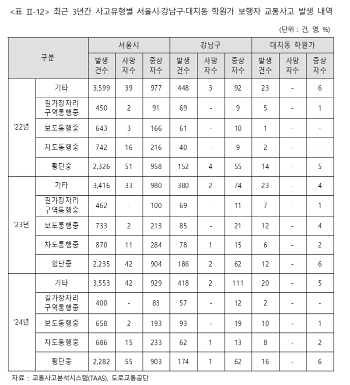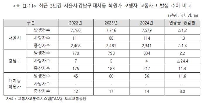 서울특별시의회 윤영희 의원이 제안하고 서울시 재정분석담당관이 분석한 자료에 따르면, 최근 3년간(2022~2024년) 서울시 전체 보행자 교통사고는 연평균 1.2% 감소했다. 그러나 대치동 학원가에서는 2022년 45건에서 2024년 56건으로 연평균 11.6% 증가했다.