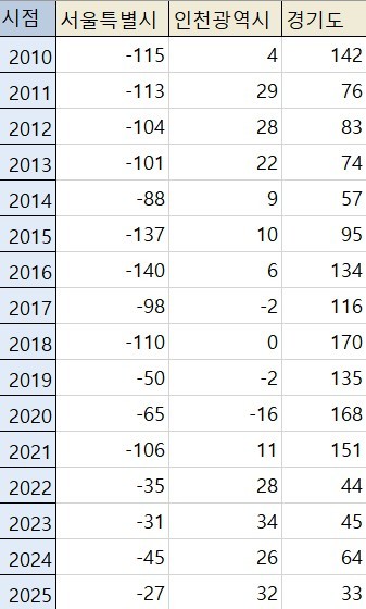 지난해 경기의 순유입 규모는 3만 3000명으로 역대 가장 작았다. 경기 순유입 규모는 2016∼2021년 10만 명대에서 2022년 4만 4000명, 2023년 4만 5000명으로 줄었다. 2024년에 6만 4000명으로 늘었다가 지난해는 다시 축소됐다.