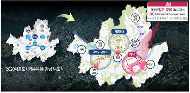 | ▲2030 서울플랜, 2040 서울도시기본계획(강남 도심 승격) |
