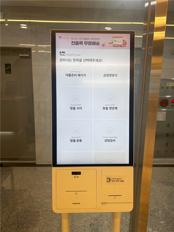 TLC헬스케어의 키오스크 시스템은 간편한 주문과 다양한 결제 수단을 지원하며, 주문된 제품은 지정된 주소지로 직배송된다.