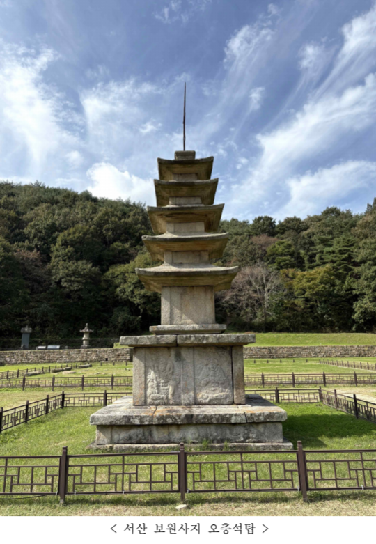‘서산 보원사지 오층석탑’은 통일신라 말에서 고려 초에 창건된 보원사지에 위치하며, 고려시대 법인국사 탄문이 거주하면서 중창된 것으로 알려져 있다.