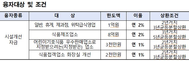 지원 대상은 서울에서 영업 중인 식품제조가공업소와 일반음식점 등이며, 조리장과 작업장 환경 개선, 위생 설비 보완 등 영업장 시설과 위생 수준 개선에 필요한 시설개선자금이 지원된다. 식품안전관리인증기준(HACCP) 도입을 준비하는 식품제조업소는 최대 8억 원까지, 식품접객업소는 최대 1억 원까지, 어린이 기호식품 우수판매업소는 최대 3000만 원까지 지원받을 수 있다.