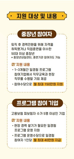 참여 중장년에게는 월 최대 150만 원의 참여수당이 지급되며, 기업은 참여자 관리와 프로그램 운영에 필요한 비용으로 참여자 1인당 월 최대 40만 원을 지원받는다. 참여를 희망하는 중장년과 기업은 19일부터 서울, 경기, 인천, 대구, 부산, 광주, 대전 등 7개 고용센터와 전국의 23개 위탁기관, 고용24 누리집에서 신청할 수 있다.