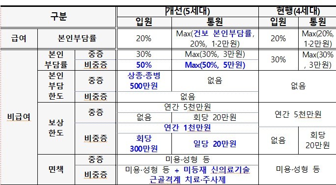 급여 통원 의료비의 본인부담률은 국민건강보험과 연동해 건강보험 본인부담제도의 정책효과를 제고하며, 급여 입원의 경우 현행 4세대와 동일하게 20%의 본인부담률을 적용한다. 비급여 의료비는 중증과 비중증으로 구분해 특약을 운영하고, 중증비급여 보장은 강화하는 한편 비중증비급여 보장은 축소해 과다 의료서비스 유인을 억제한다.
