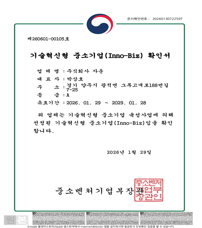 이노비즈는 기술 우위를 바탕으로 경쟁력을 확보한 중소기업에게 부여되는 국가 인증 제도로, 기술력과 시장성, 사업성을 종합적으로 심사해 결정된다. 자운은 이번 인증을 통해 금융 및 세제 혜택, 정부 R&D 사업 참여 시 가점 부여, 판로 및 수출 지원 등 다양한 정책적 지원을 받게 된다.