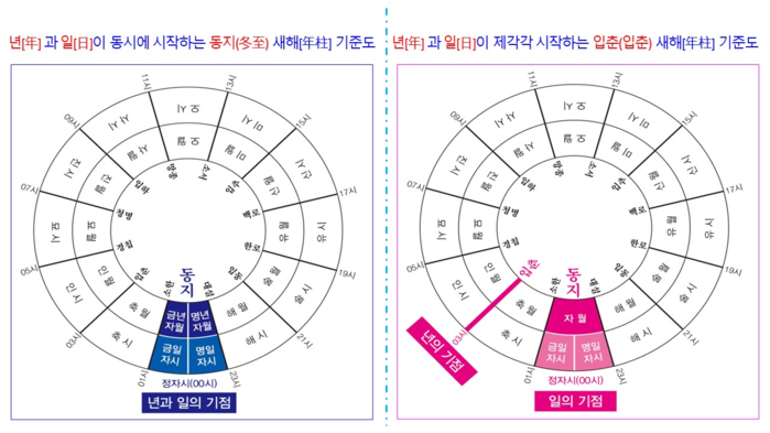 입춘(立春)으로 새해[年柱]를 정하고, 인시(寅時)로 날짜의 시작[日柱]을 정하면, 년[歲首]과 일[日首]은 같은 기점에서 동시에 시작은 되지만, 음양의 생사(生死)와 24절기의 순환법칙[順序]과는 매우 크게 어긋나 맞지 않는다. 그러나 동지(冬至)로 새해[年柱]를 정하고, 자시(子時)로 날짜의 시작[日柱]을 정하면, 년[歲首]과 일[日首]은 같은 기점에서 동시에 시작되고 음양의 생사(生死)와 24절기의 순환법칙과 정확히 맞기 때문이다.