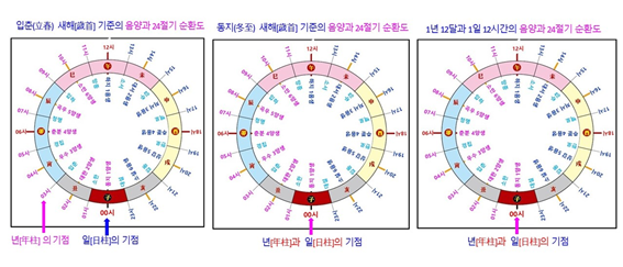 입춘(立春)으로 명리학 새해[年柱]를 정하고, 자시(子時)로 명리학 날짜의 시작[日柱]을 정하면 년[年柱]과 일[日柱]은 약 45도 떨어진 곳에서 제각각 시작되고, 동지(冬至)로 명리학 새해[年柱]를 정하고, 자시(子時)로 명리학 날짜의 시작[日柱]을 정하면 년[年柱]과 일[日柱]은 동지점[00시점]에서 동시에 시작된다. 이는 명리학 입춘(立春) 새해[年柱] 기준은 음양과 24절기의 순환법칙과 맞지 않는 오류임을 입증하는 확실한 근거가 된다.